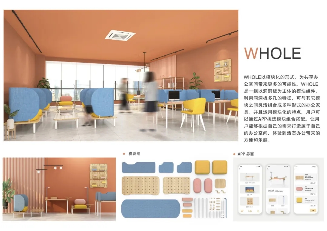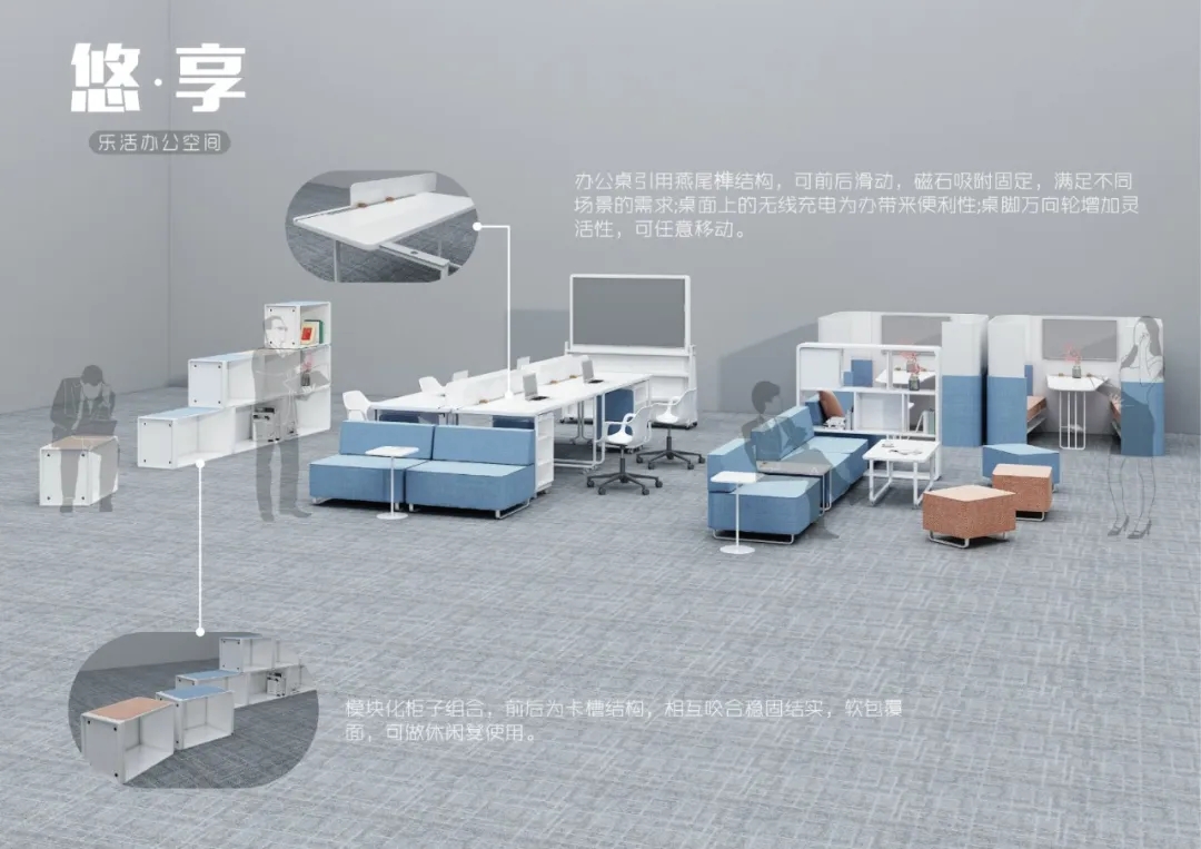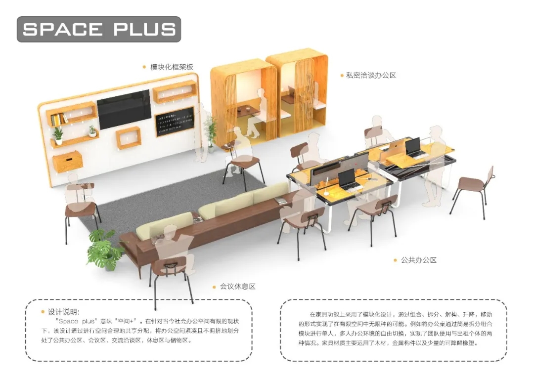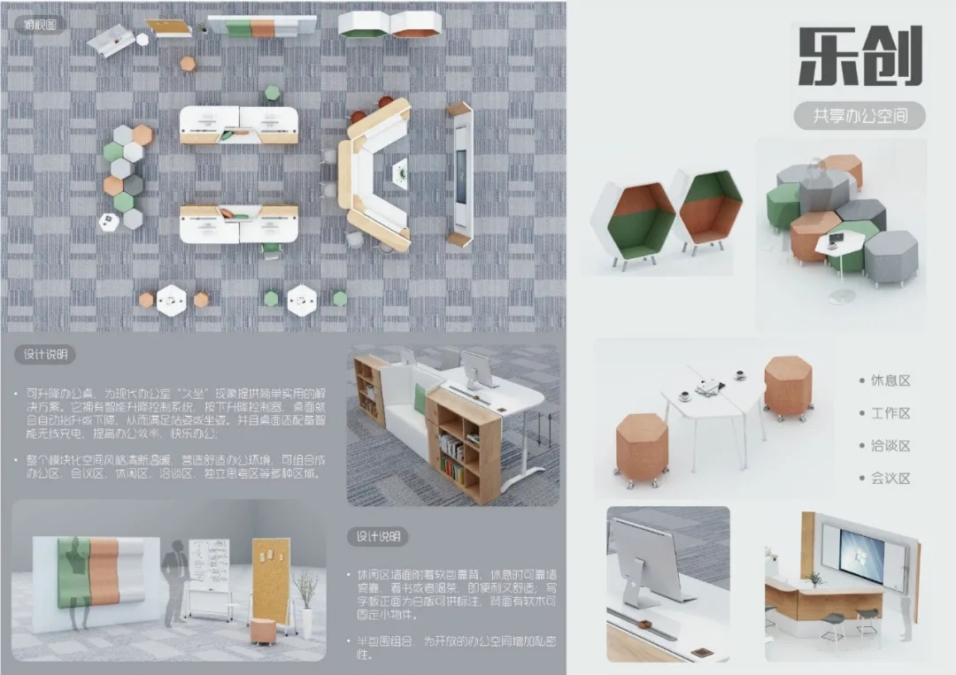 作品的策劃與大賽主題的整體關系,有清晰的創作概念示意圖,滿足共享辦公需求的辦公家具設計作品。